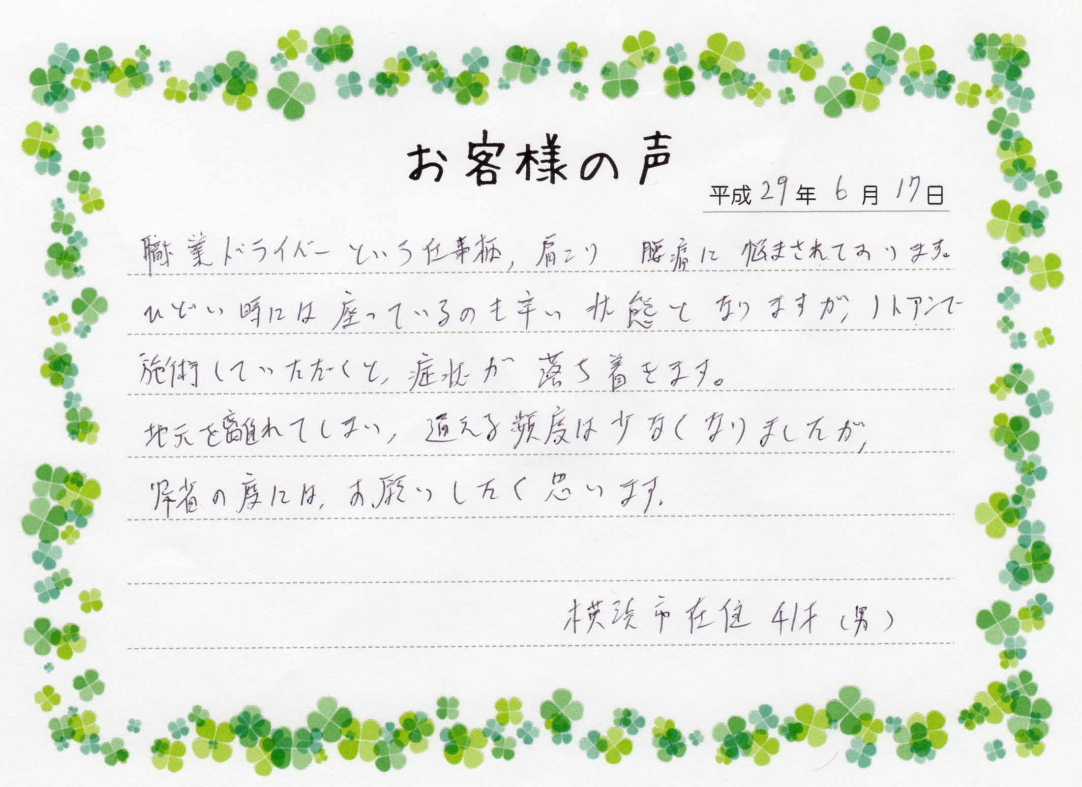 職業ドライバーという仕事柄、肩こり腰痛になやまされております。