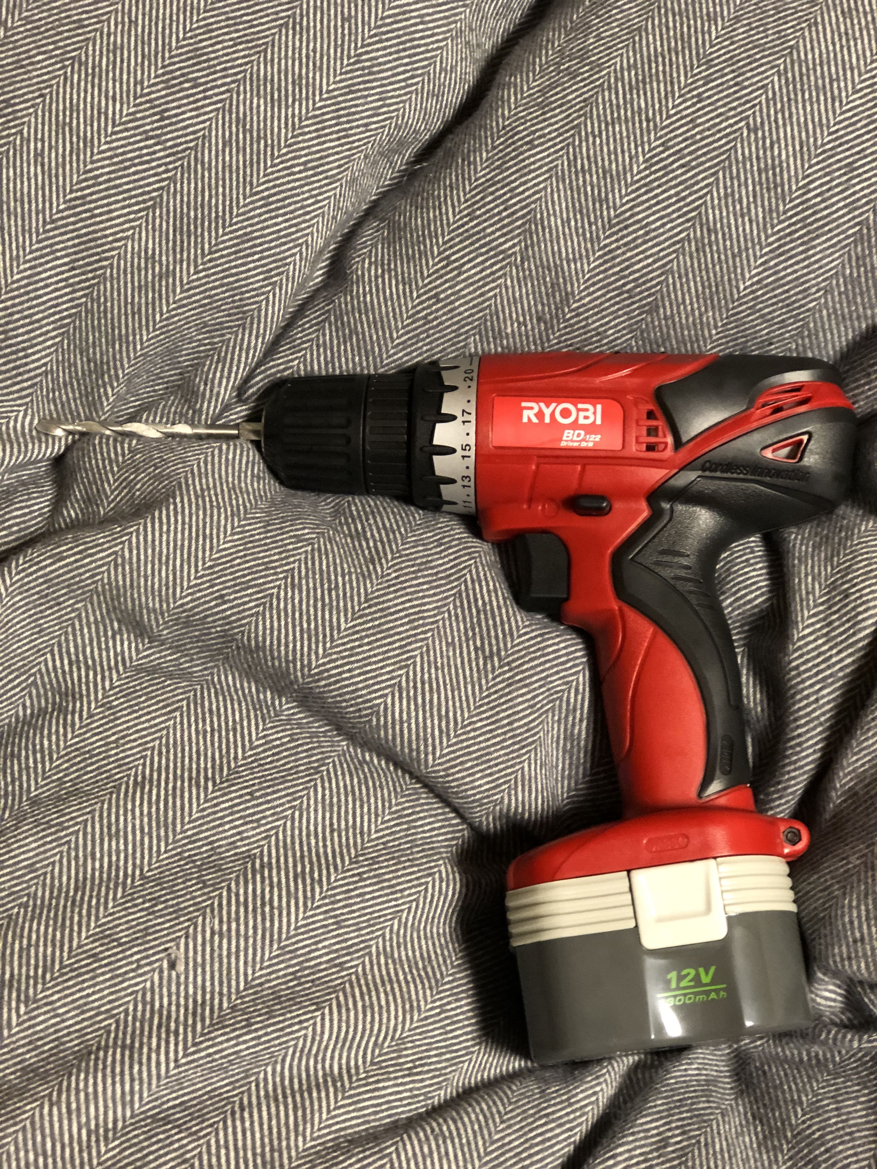 まずは金具の取り付けですが、壁の中の柱を見つけて取り付け位置を決めてから、5ミリのドリルで4ヶ所穴を開けます。